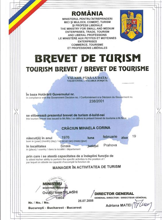 - Brevet de turism nr. 13934/25.07.2008 - detinut de Craciun Mihaela Corina, Manager in activitatea de turism