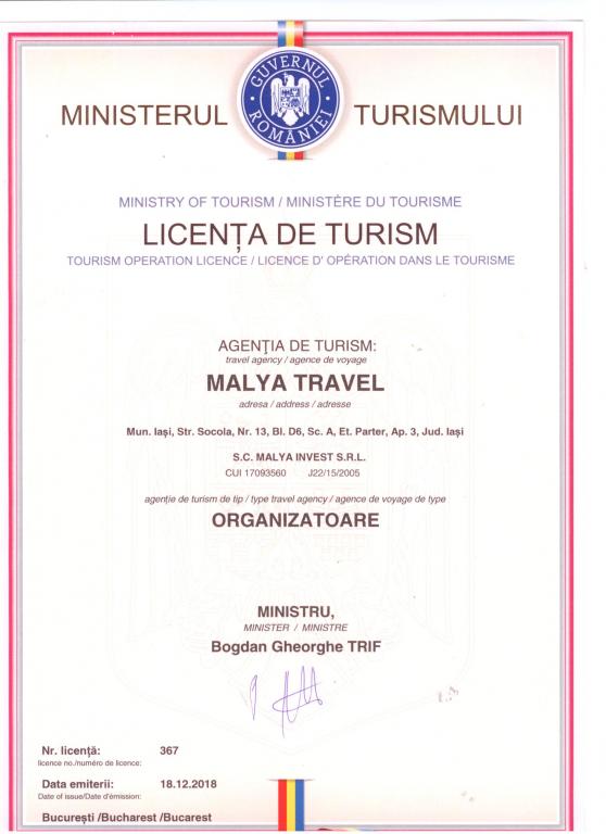 - Numarul Licentei de Turism: 367/18.12.2018 (eliberata de MTCT)